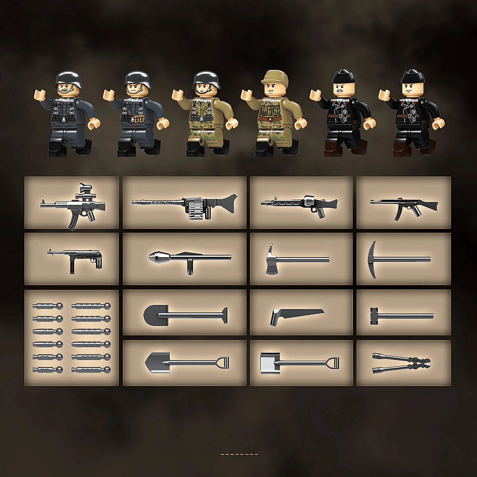 • Infantry Soldier 1ย โ€“ Tan camouflage uniform with chest pouches and grenade belt.